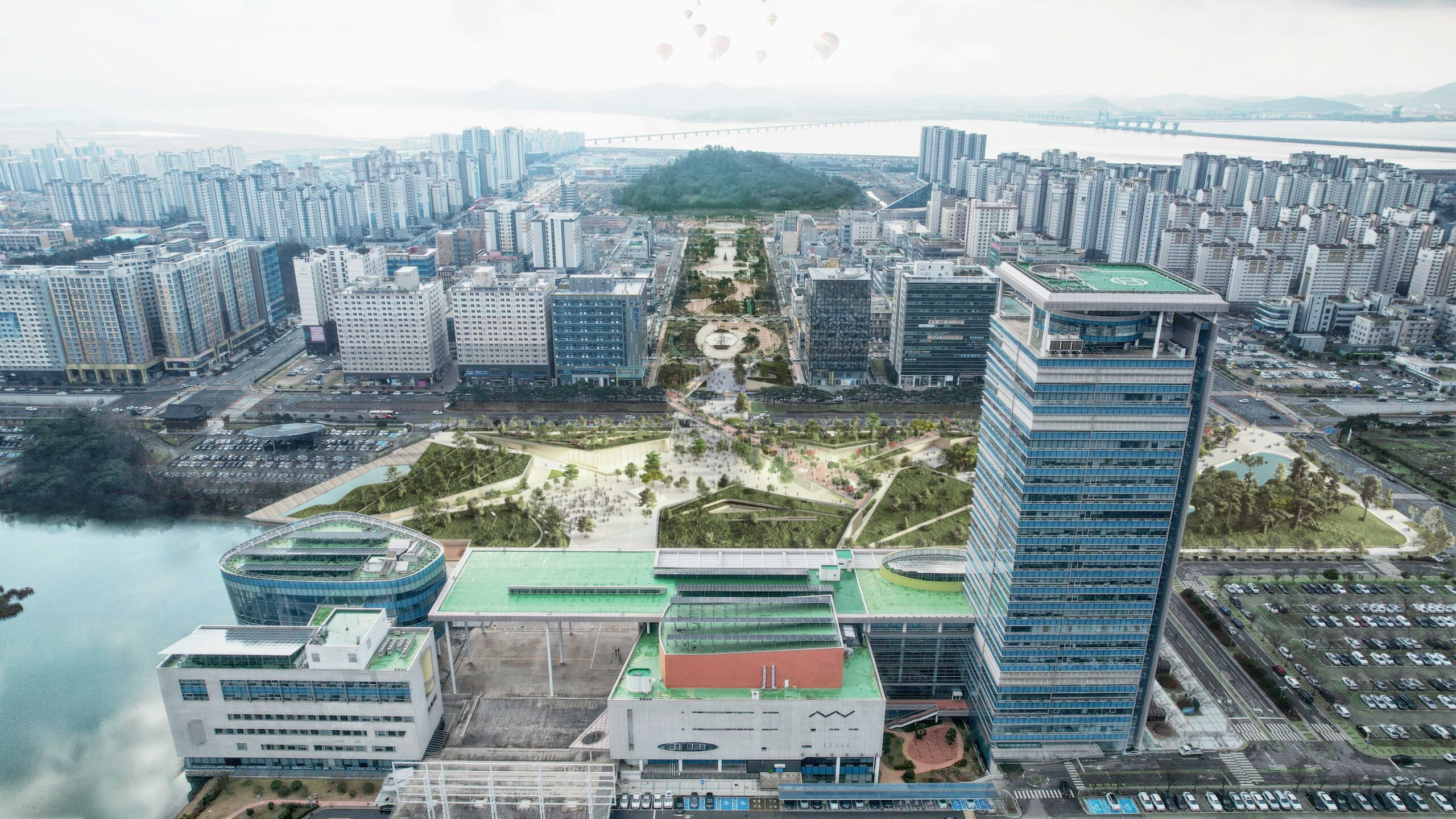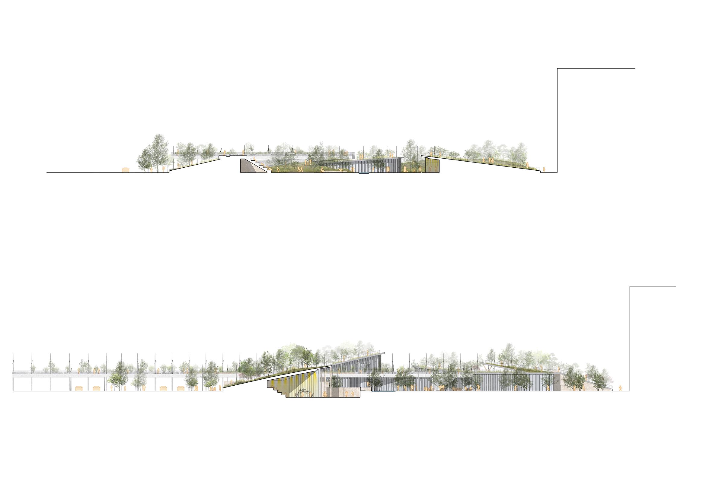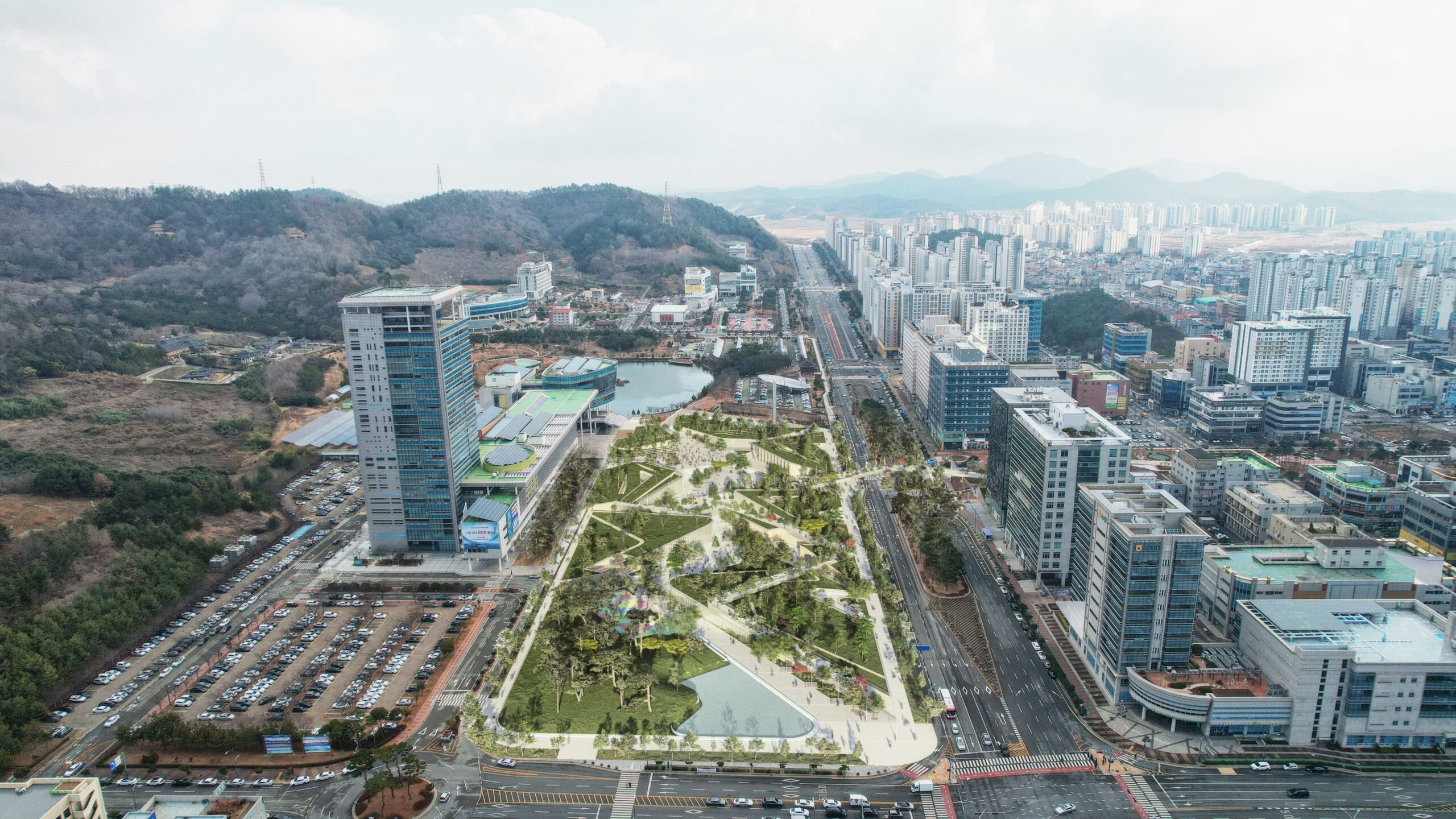 Dans la continuité du parc central, au bord du lac Nam Ak et face au bureau provincial, le projet prend la forme d’une grande colline inspirée des reliefs de Muan-gun. Une faille découpe cette colline et crée une diversité de paysages propices à la promenade et à la découverte. Prolongée par une passerelle en béton, la place relie la ville de l’autre côté de la route Hugwang-daero, formant un espace public aérien.