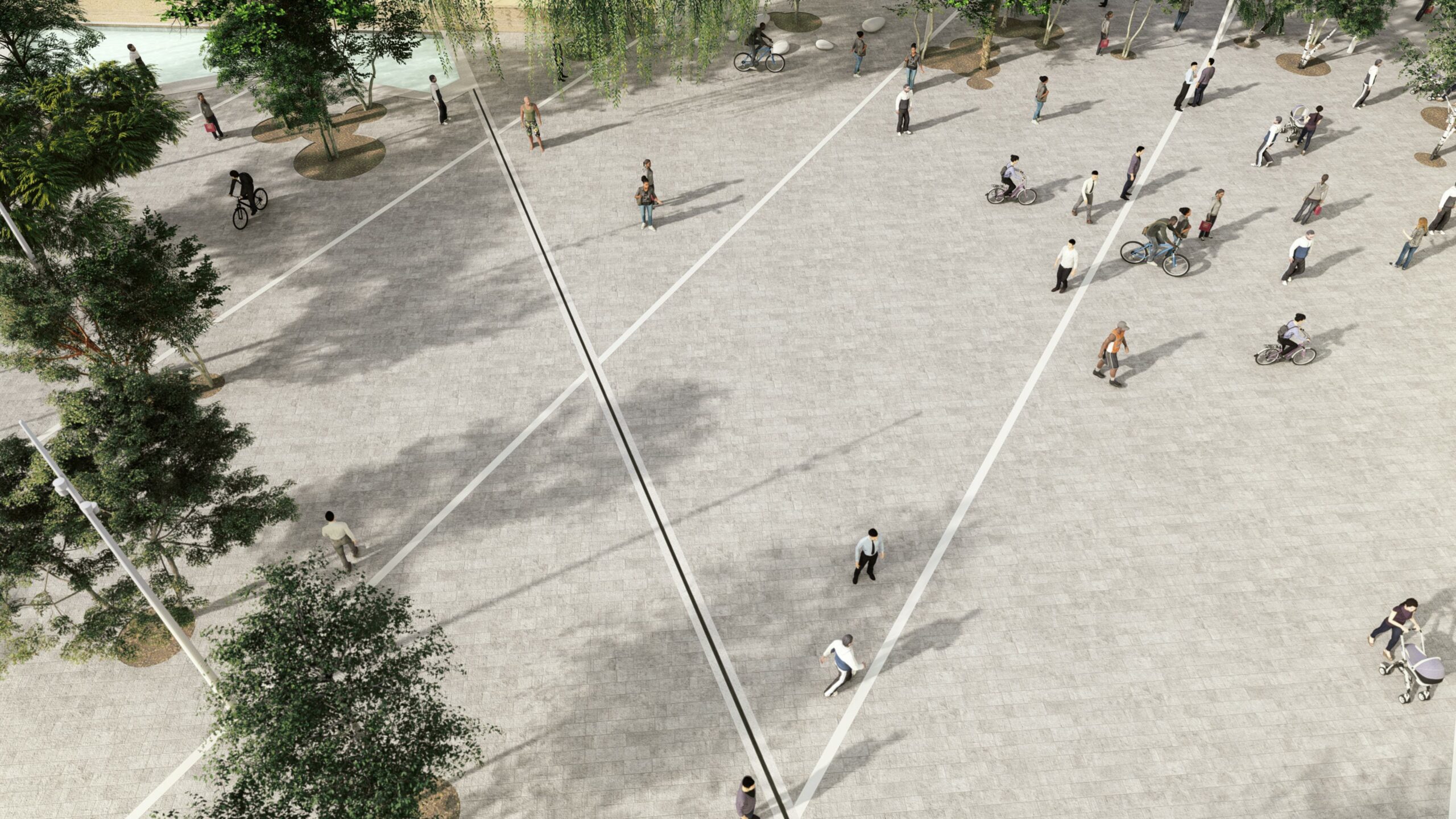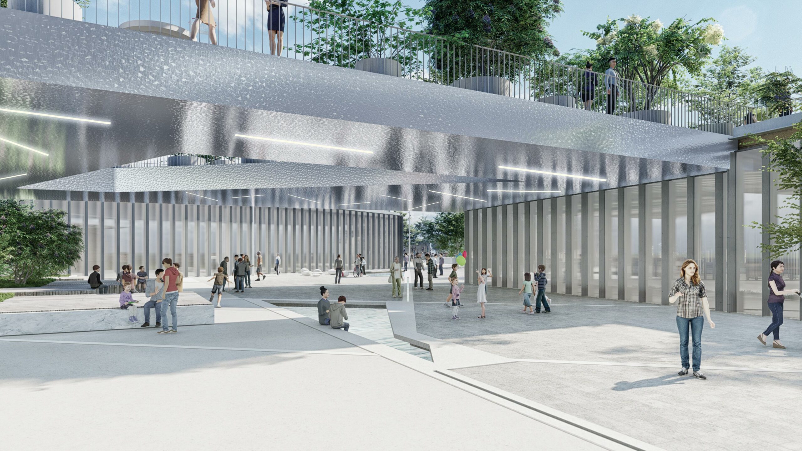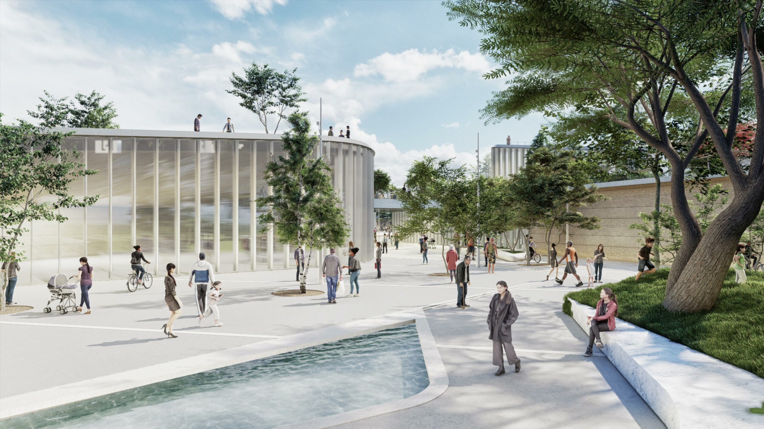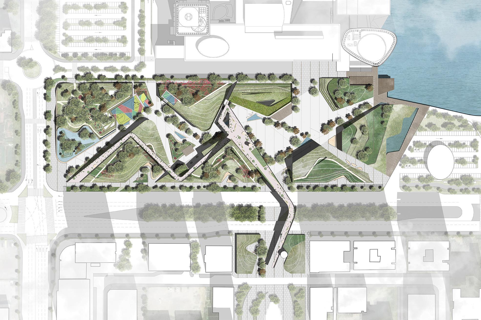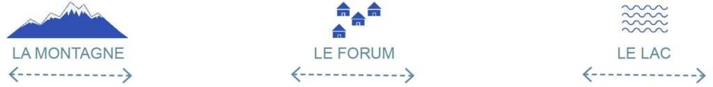 La faille se déploie en trois séquences : la montagne, le forum et le lac, chacune animée par des ambiances et des usages variés. Pavillons et bâtiments s’insèrent dans les interstices du relief, donnant vie aux allées et aux parcs. Cette place publique accueille une grande diversité d’activités, mêlant intérieur et extérieur, pour rassembler toutes les générations. Fortement ancrés dans le contexte local, les programmes culturels — théâtre, centre culturel, bibliothèque, ateliers d’art — encouragent la découverte de la culture régionale, tandis que le marché et les restaurants valorisent les produits de la terre et de la mer.